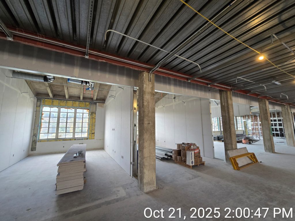 The framing subcontractor is continuing with the installation of insulation and drywall, including ongoing mudding and taping at the curtain wall system and interior walls.