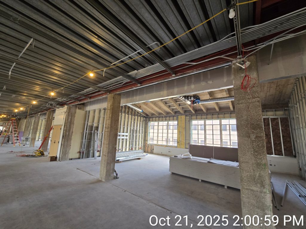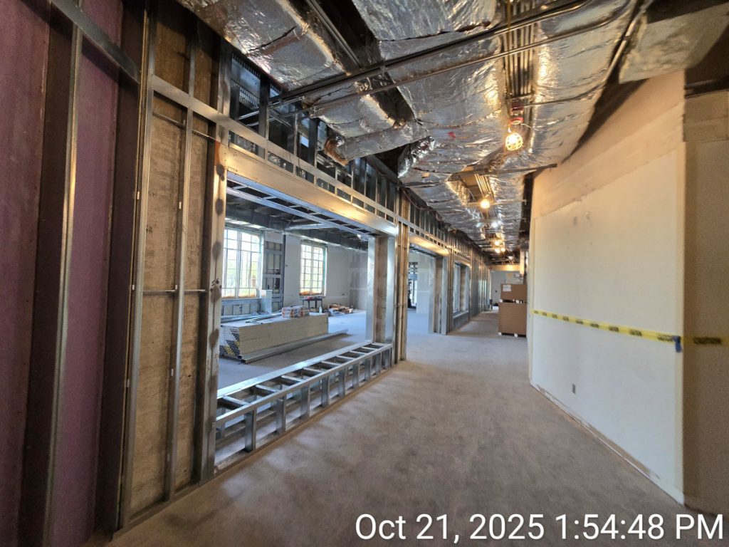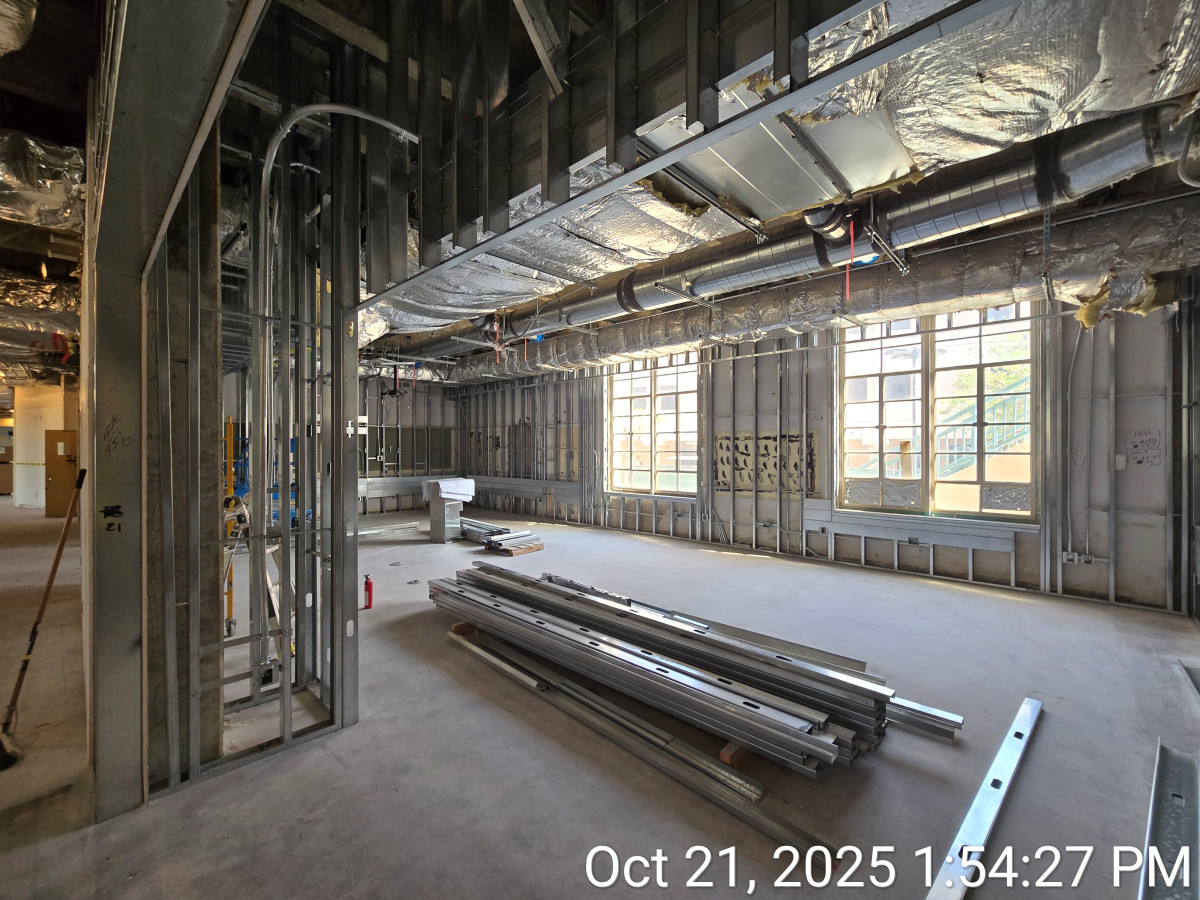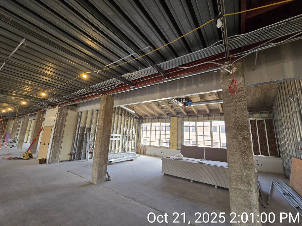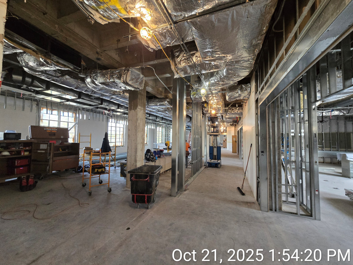 Framing installation of storefront and wall metal studs along the corridor side of the VR Computer Lab is continuing.