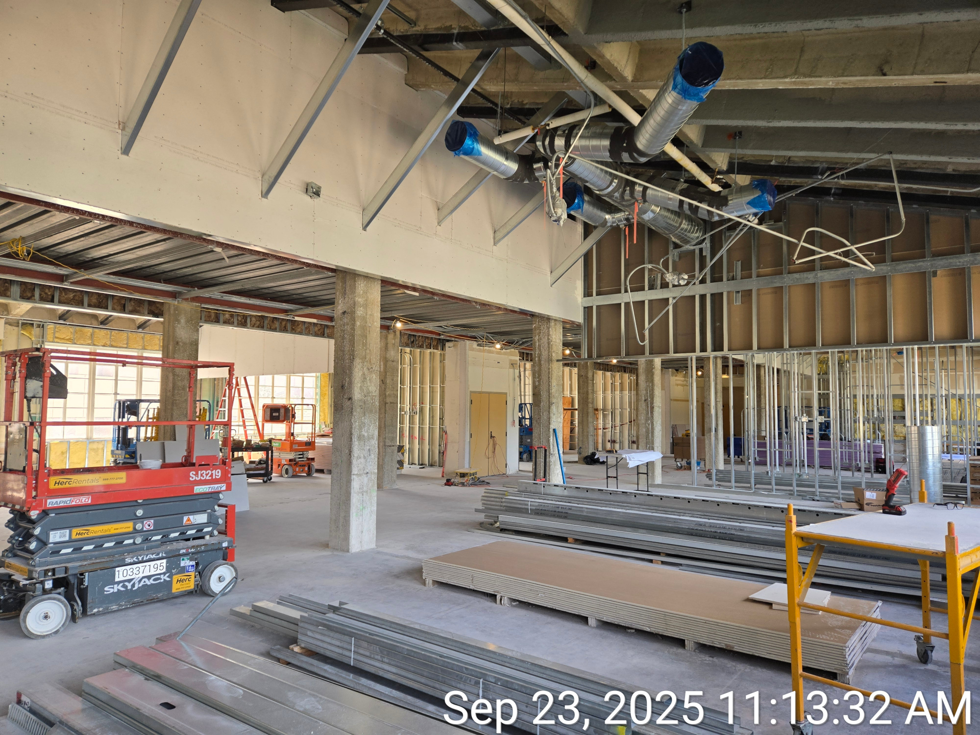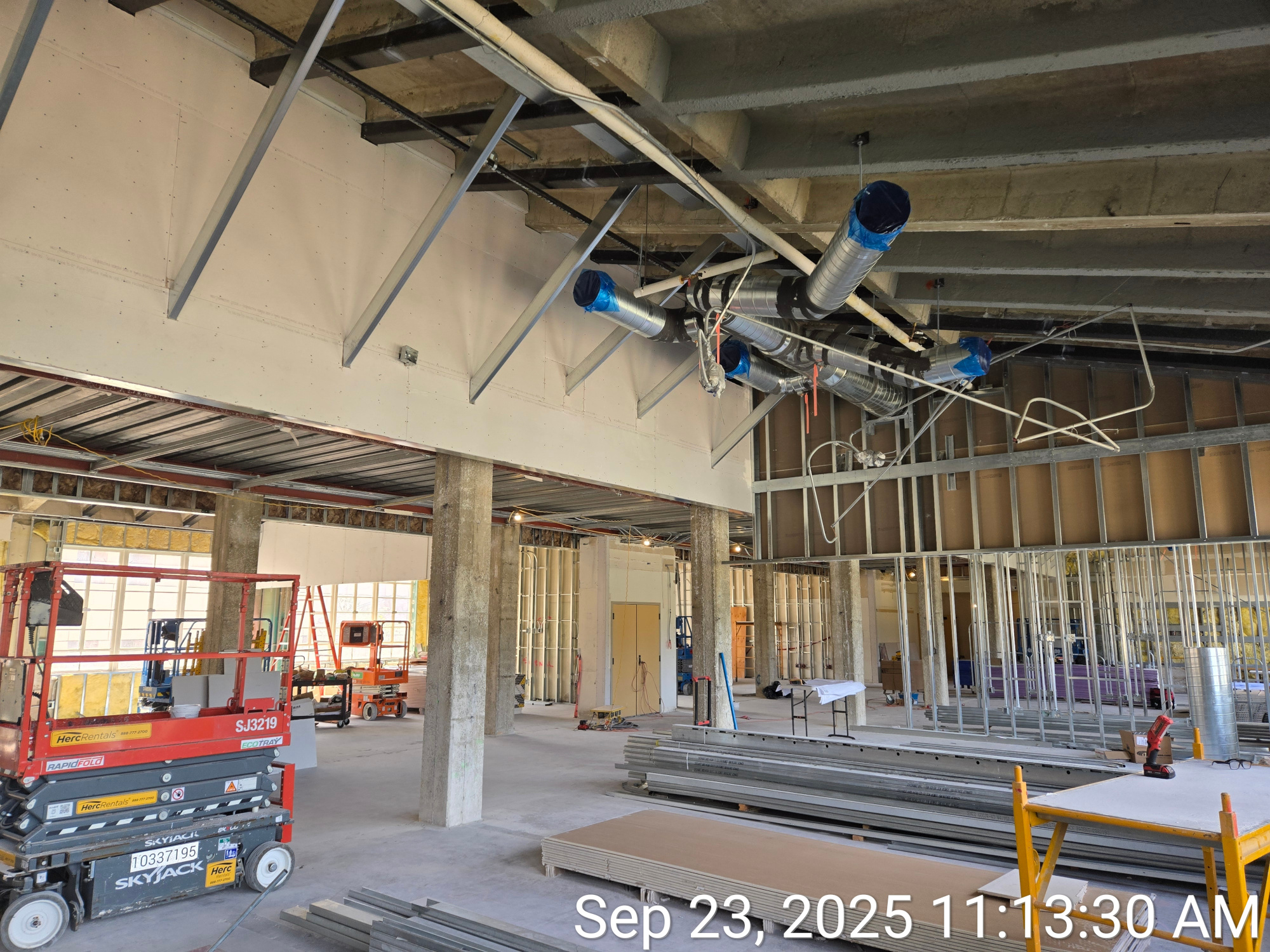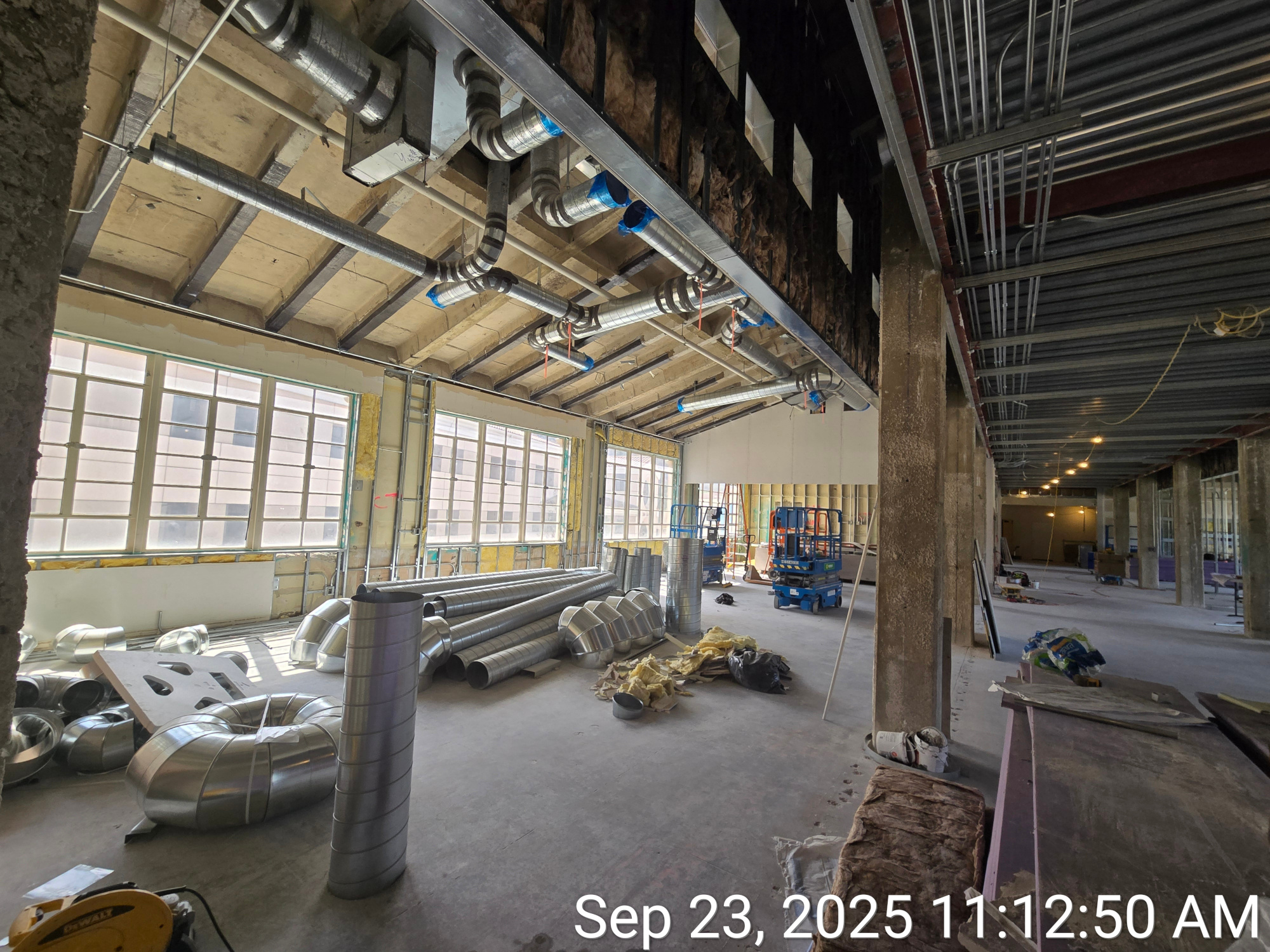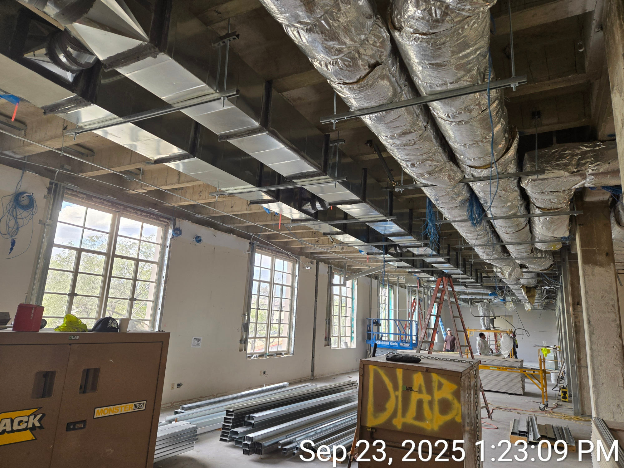 The mechanical subcontractor continued installing threaded rods and Unistrut supports for the new HVAC ductwork, as well as metal duct installation.